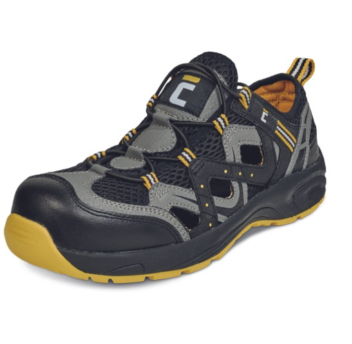 » biztonsági szandál kompozit lábujjvédővel » antisztatikus, csúszásbiztos phylon/gumi talp » energiaelnyelő sarok » bőr és PES háló felsőrész » sárga részletek a fokozott láthatóságért